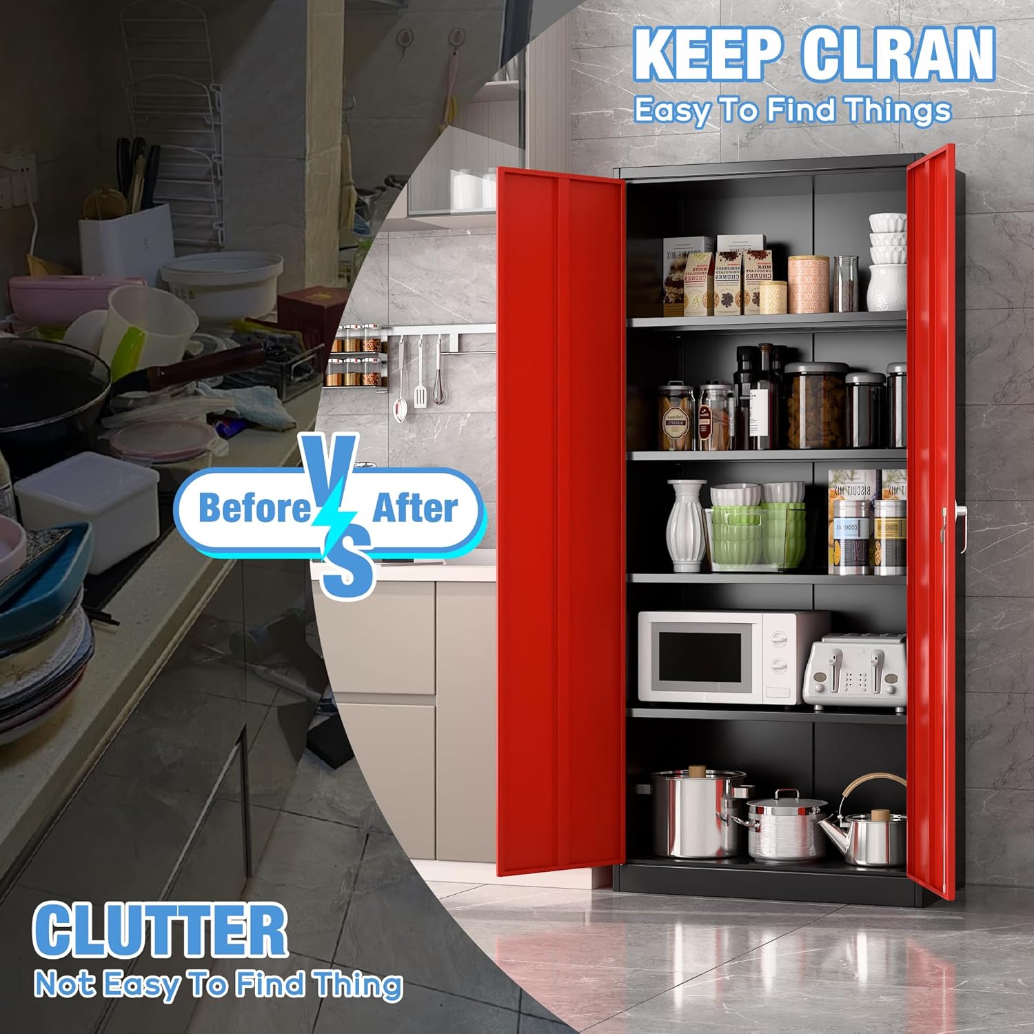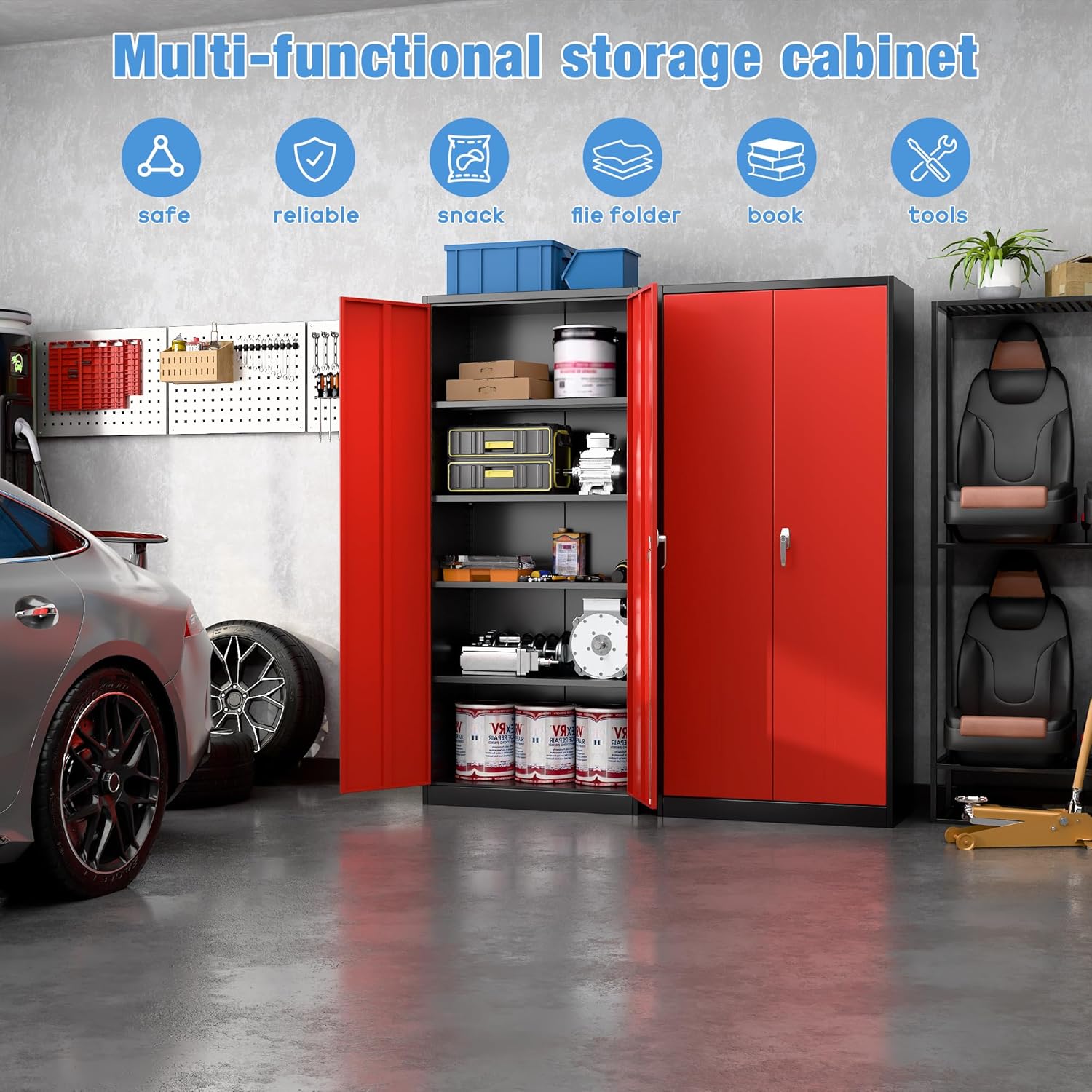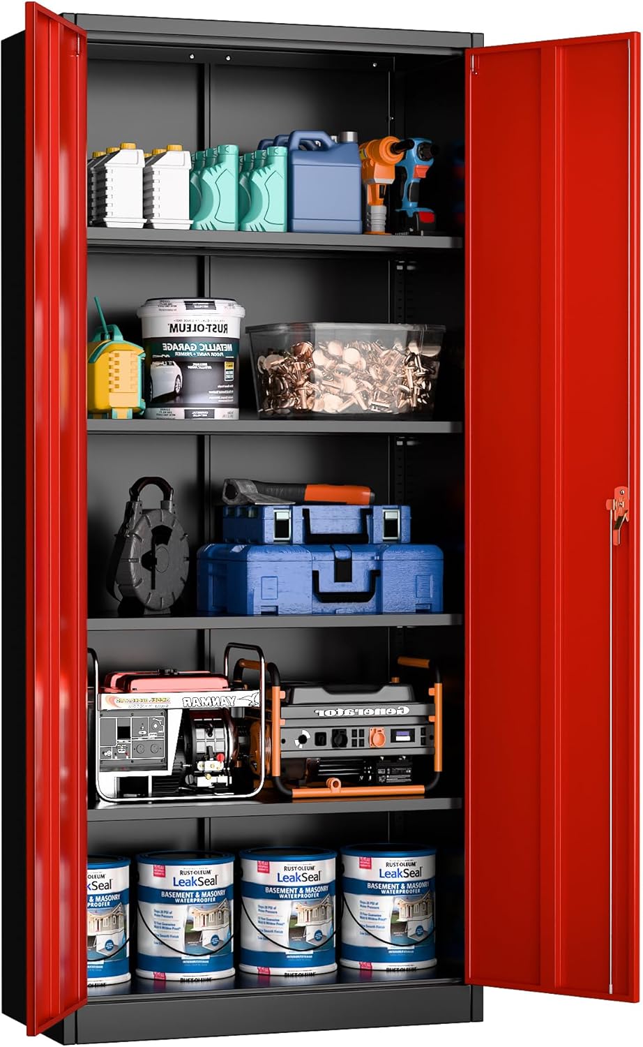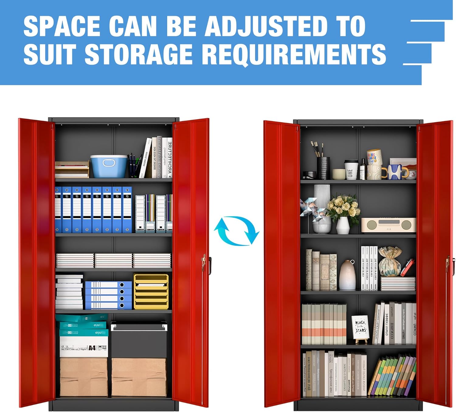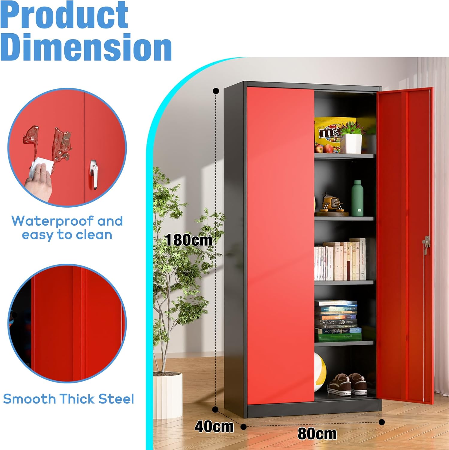 SUPEER Filing Cabinet, Metal Cabinet With 4 Height-Adjustable Shelves, Sheet Steel Powder Coating, Steel Cabinet For Tools, Garage, 180 X 80 X 40 Cm Black Red